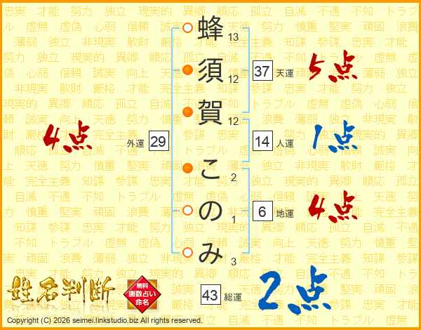 蜂(13画)須(12画)賀(12画) こ(2画)の(1画)み(3画)