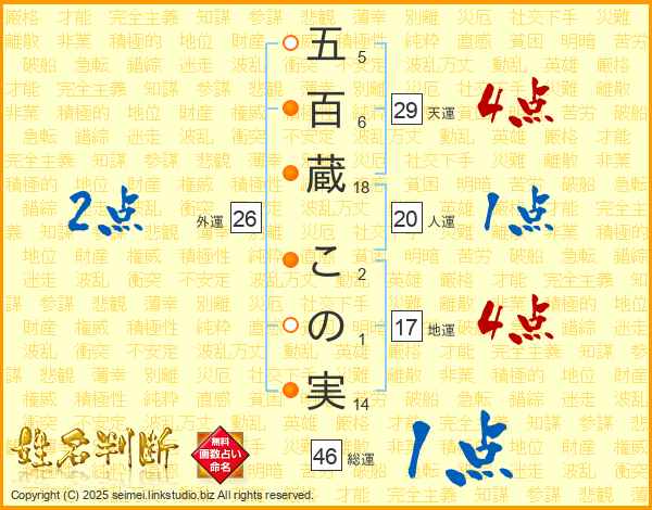 生活面を象徴する運勢です。外部から受ける影響力を表し、結婚運、家庭運や職場、環境への順応性を表します。総運から人運を引いた画数。姓や名が1文字の場合を除く。