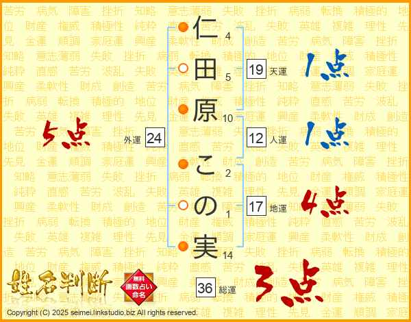 仁(4画)田(5画)原(10画) こ(2画)の(1画)実(14画)