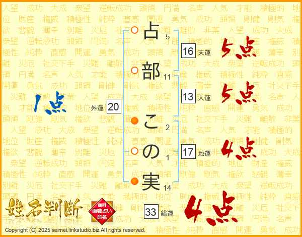 生活面を象徴する運勢です。外部から受ける影響力を表し、結婚運、家庭運や職場、環境への順応性を表します。総運から人運を引いた画数。姓や名が1文字の場合を除く。