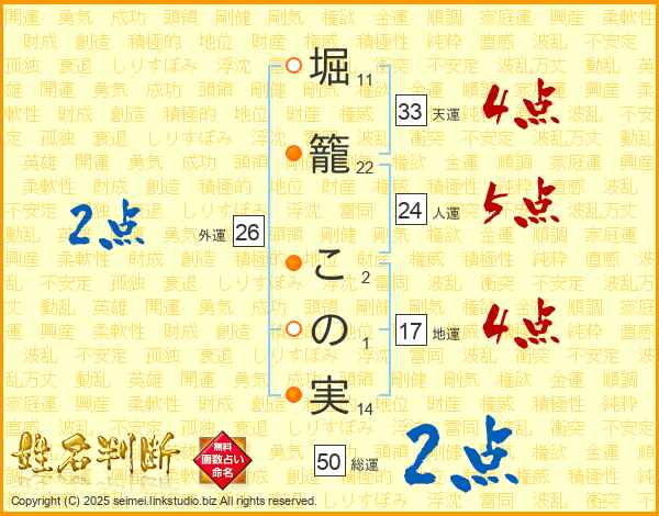 堀(11画)籠(22画) こ(2画)の(1画)実(14画)