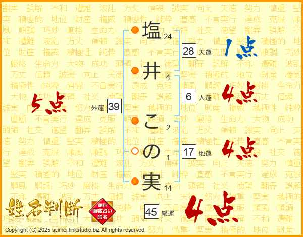 塩(24画)井(4画) こ(2画)の(1画)実(14画)