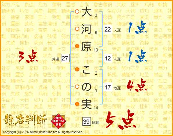 大河原この実さんの総運は39画の5点!