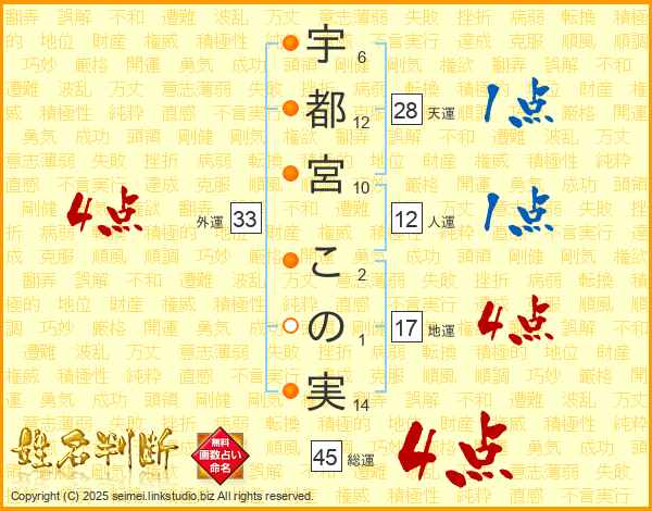 宇(6画)都(12画)宮(10画) こ(2画)の(1画)実(14画)