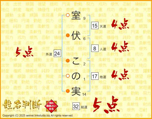 生活面を象徴する運勢です。外部から受ける影響力を表し、結婚運、家庭運や職場、環境への順応性を表します。総運から人運を引いた画数。姓や名が1文字の場合を除く。