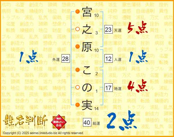宮(10画)之(3画)原(10画) こ(2画)の(1画)実(14画)
