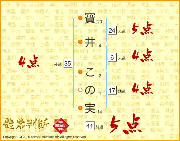 寶(20画)井(4画) こ(2画)の(1画)実(14画)