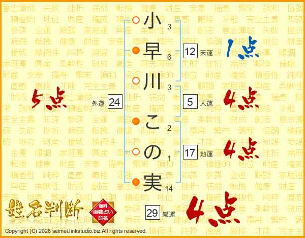 小(3画)早(6画)川(3画) こ(2画)の(1画)実(14画)