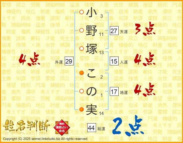 生活面を象徴する運勢です。外部から受ける影響力を表し、結婚運、家庭運や職場、環境への順応性を表します。総運から人運を引いた画数。姓や名が1文字の場合を除く。