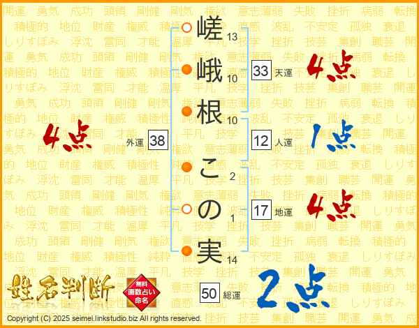 嵯(13画)峨(10画)根(10画) こ(2画)の(1画)実(14画)