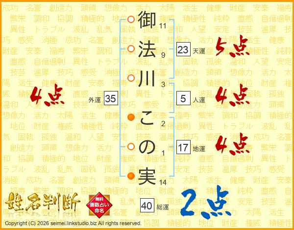 御(11画)法(9画)川(3画) こ(2画)の(1画)実(14画)