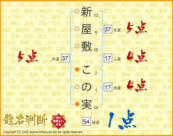 新(13画)屋(9画)敷(15画) こ(2画)の(1画)実(14画)