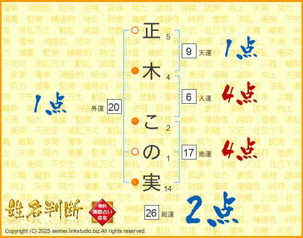 正(5画)木(4画) こ(2画)の(1画)実(14画)