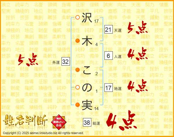 沢(17画)木(4画) こ(2画)の(1画)実(14画)