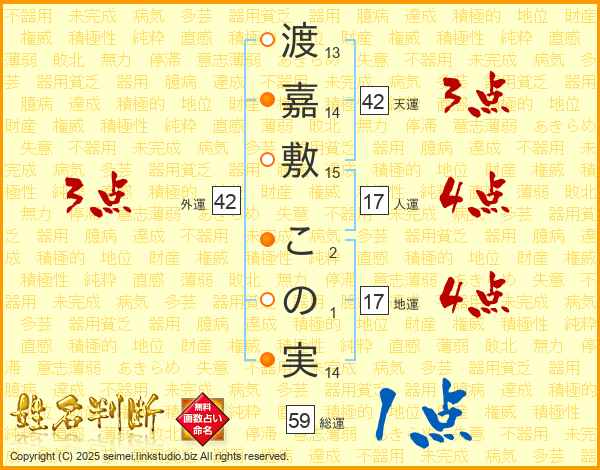 渡(13画)嘉(14画)敷(15画) こ(2画)の(1画)実(14画)