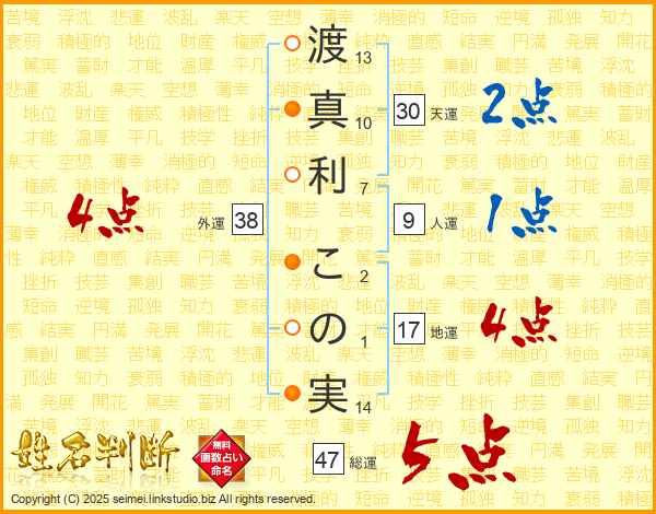 生活面を象徴する運勢です。外部から受ける影響力を表し、結婚運、家庭運や職場、環境への順応性を表します。総運から人運を引いた画数。姓や名が1文字の場合を除く。