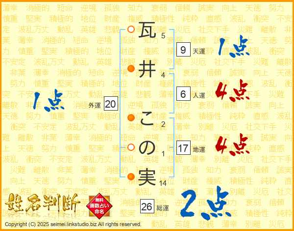 生活面を象徴する運勢です。外部から受ける影響力を表し、結婚運、家庭運や職場、環境への順応性を表します。総運から人運を引いた画数。姓や名が1文字の場合を除く。