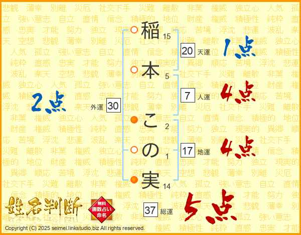 稲(15画)本(5画) こ(2画)の(1画)実(14画)