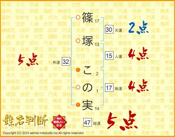 篠(17画)塚(13画) こ(2画)の(1画)実(14画)
