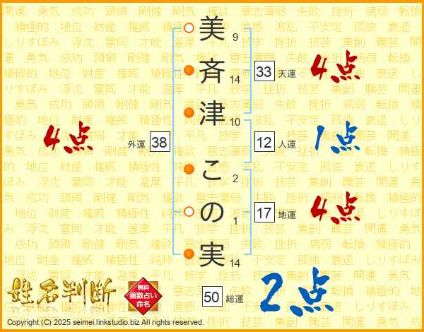 美(9画)斉(14画)津(10画) こ(2画)の(1画)実(14画)