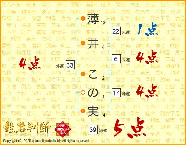 薄(18画)井(4画) こ(2画)の(1画)実(14画)
