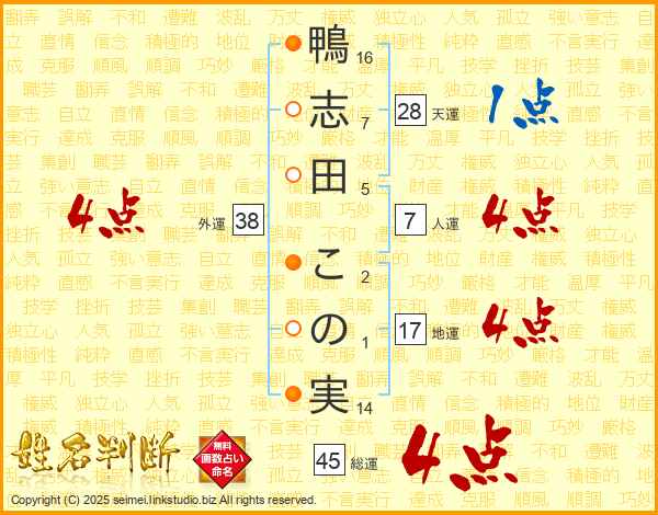 鴨(16画)志(7画)田(5画) こ(2画)の(1画)実(14画)