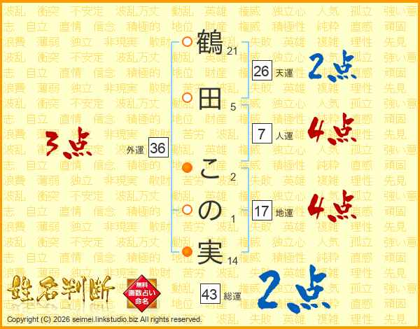 鶴(21画)田(5画) こ(2画)の(1画)実(14画)