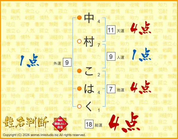 中(4画)村(7画) こ(2画)は(4画)く(1画)