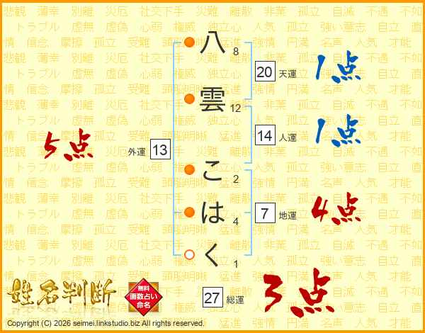 生活面を象徴する運勢です。外部から受ける影響力を表し、結婚運、家庭運や職場、環境への順応性を表します。総運から人運を引いた画数。姓や名が1文字の場合を除く。
