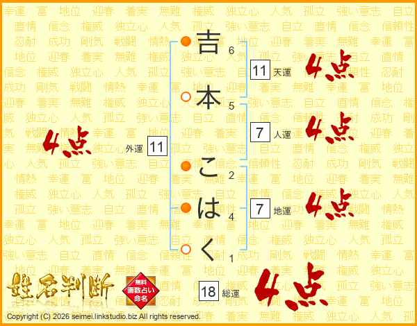 吉(6画)本(5画) こ(2画)は(4画)く(1画)