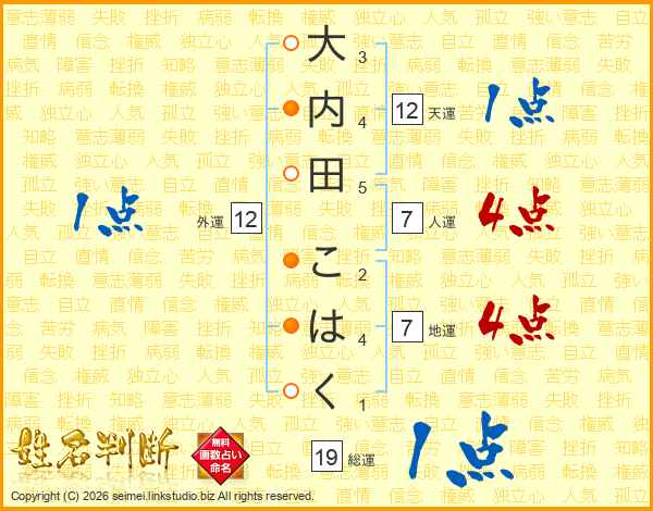 生活面を象徴する運勢です。外部から受ける影響力を表し、結婚運、家庭運や職場、環境への順応性を表します。総運から人運を引いた画数。姓や名が1文字の場合を除く。