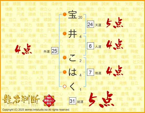 宝(20画)井(4画) こ(2画)は(4画)く(1画)