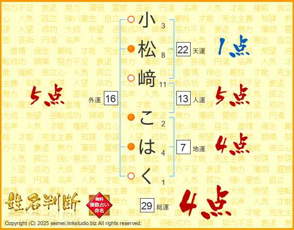 生活面を象徴する運勢です。外部から受ける影響力を表し、結婚運、家庭運や職場、環境への順応性を表します。総運から人運を引いた画数。姓や名が1文字の場合を除く。