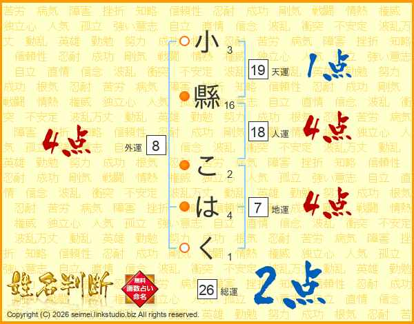 生活面を象徴する運勢です。外部から受ける影響力を表し、結婚運、家庭運や職場、環境への順応性を表します。総運から人運を引いた画数。姓や名が1文字の場合を除く。