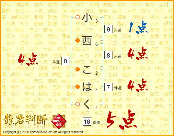 小西こはくさんの総運は16画の5点!