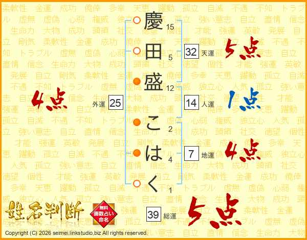 慶(15画)田(5画)盛(12画) こ(2画)は(4画)く(1画)