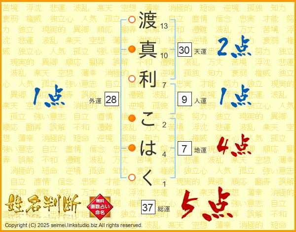 渡(13画)真(10画)利(7画) こ(2画)は(4画)く(1画)
