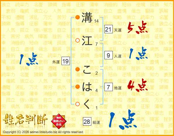 生活面を象徴する運勢です。外部から受ける影響力を表し、結婚運、家庭運や職場、環境への順応性を表します。総運から人運を引いた画数。姓や名が1文字の場合を除く。