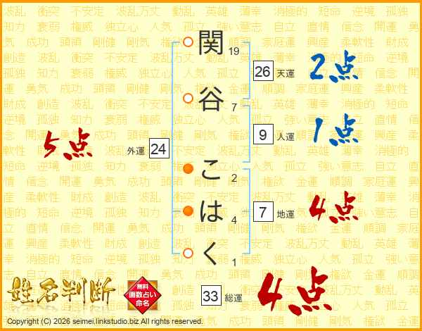 関谷こはくさんの総運は33画の4点!