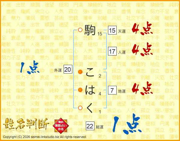 生活面を象徴する運勢です。外部から受ける影響力を表し、結婚運、家庭運や職場、環境への順応性を表します。総運から人運を引いた画数。姓や名が1文字の場合を除く。