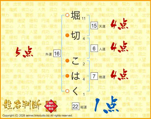 堀(11画)切(4画) こ(2画)は(4画)く(1画)