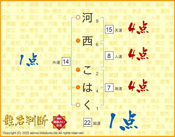 生活面を象徴する運勢です。外部から受ける影響力を表し、結婚運、家庭運や職場、環境への順応性を表します。総運から人運を引いた画数。姓や名が1文字の場合を除く。