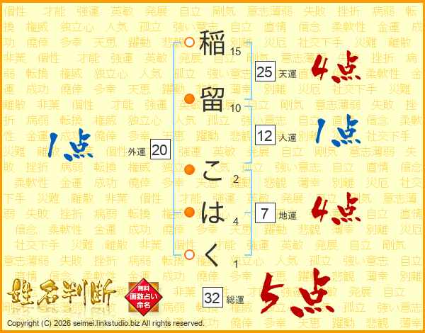 生活面を象徴する運勢です。外部から受ける影響力を表し、結婚運、家庭運や職場、環境への順応性を表します。総運から人運を引いた画数。姓や名が1文字の場合を除く。