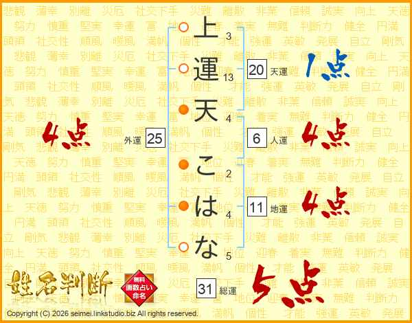 生活面を象徴する運勢です。外部から受ける影響力を表し、結婚運、家庭運や職場、環境への順応性を表します。総運から人運を引いた画数。姓や名が1文字の場合を除く。