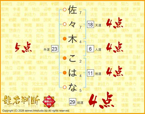 佐々木こはなさんの総運は29画の4点!
