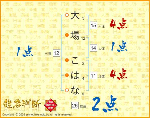 生活面を象徴する運勢です。外部から受ける影響力を表し、結婚運、家庭運や職場、環境への順応性を表します。総運から人運を引いた画数。姓や名が1文字の場合を除く。