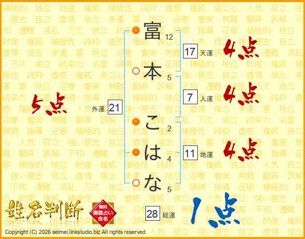 富本こはなさんの外運は21画の5点!