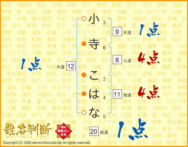 生活面を象徴する運勢です。外部から受ける影響力を表し、結婚運、家庭運や職場、環境への順応性を表します。総運から人運を引いた画数。姓や名が1文字の場合を除く。