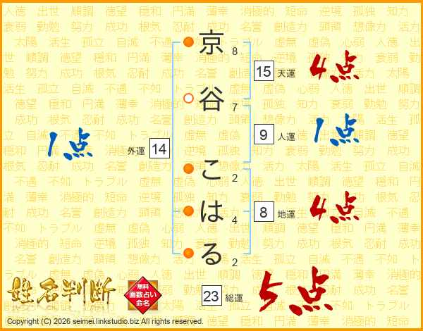 京谷こはるさんの総運は23画の5点!