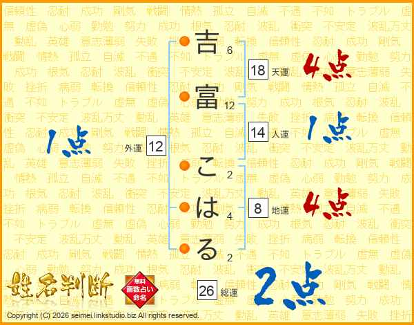 吉(6画)富(12画) こ(2画)は(4画)る(2画)